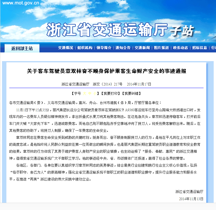 省交通運輸廳發(fā)出章雙林事跡通報 號召全省交通運輸系統(tǒng)干部職工學習