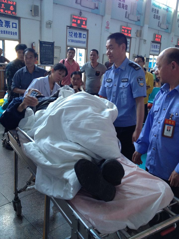5月8日下午16:00左右,東站保潔員吳麗君在打掃候車室的男廁所衛(wèi)生時,發(fā)現(xiàn)一位80多歲、老人身著病號褲的老人家呼吸困難、面色暗黃地倒在廁所內(nèi)。吳麗君急忙上前詢問,老人目光無神,神志不清,已經(jīng)說不出話了。