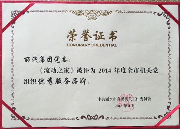 近日,麗汽集團(tuán)“流動(dòng)之家”服務(wù)品牌在中共麗水市直屬機(jī)關(guān)工作委員會(huì)開展的2014年度全市機(jī)關(guān)黨組織優(yōu)秀學(xué)習(xí)品牌、優(yōu)秀服務(wù)品牌評(píng)選活動(dòng)中,喜獲“2014年度全市機(jī)關(guān)黨組織優(yōu)秀服務(wù)品牌”稱號(hào)。